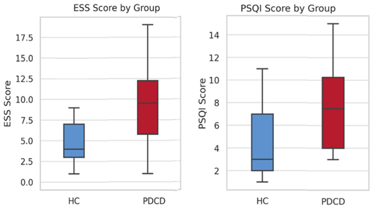 Risultati. La Figura 1 mostra che pazienti con PDCD hanno punteggi significativamente più alti al PSQI (p=.01, η²p=.16) e all’ESS (p=.02, η²p=.13) rispetto ai partecipanti HC, mostrando una maggiore tendenza a fenomeni di sonnolenza diurna e bassa qualità e durata di sonno notturno, rispettivamente. La potenza EEG nelle bande delta (p=.01, η²p=.18) e theta (p=.03, η²p=.12) era maggiore nei pazienti con PDCD rispetto ai controlli. I punteggi dell’ESS e la componente del PSQI per la disfunzione diurna (C7) erano positivamente associate alla potenza delta (rho=.36 e .39) e theta (rho=.38 e .42) (tutte p<.01) delle sorgenti corticali dell’attività EEG. Inoltre, entrambe le misure ESS e PSQI erano negativamente correlate con l’accuratezza nella prestazione ai videogiochi seri (rho=–.43 e –.38 con p<.01, rispettivamente).