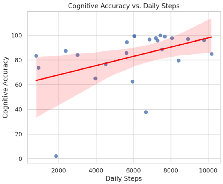Figura 1. Diagrammi di dispersione che mostrano l’associazione tra la media dei passi giornalieri e l’accuratezza delle risposte ai videogiochi seri della piattaforma SmartMe&You in una coorte di 28 anziani – 18 con declino cognitivo lieve dovuto alla malattia di Parkinson e 10 controlli cognitivamente sani – appaiati per età e sesso. Un numero maggiore di passi giornalieri è positivamente associato a una maggiore accuratezza nelle risposte ai videogiochi seri della piattaforma SmartMe&You (p <.05).